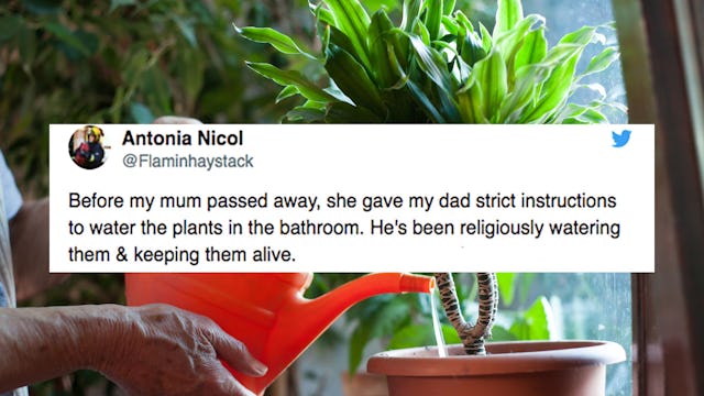 Antonia, a firefighter in London, said in subsequent tweets that whenever the water would overflow the plants (you know, because of the whole plastic thing), her dad just assumed the toilet was leaking. “When she died, my dad was grief stricken and just followed her wishes,” she told Scary Mommy. “He religiously watered them for a few years.”
