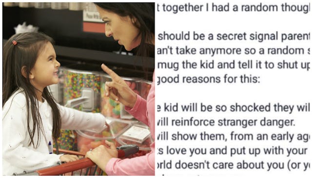 “There should be a secret signal parents give when they can’t take anymore so a random stranger can mean mug the kid and tell it to shut up.”