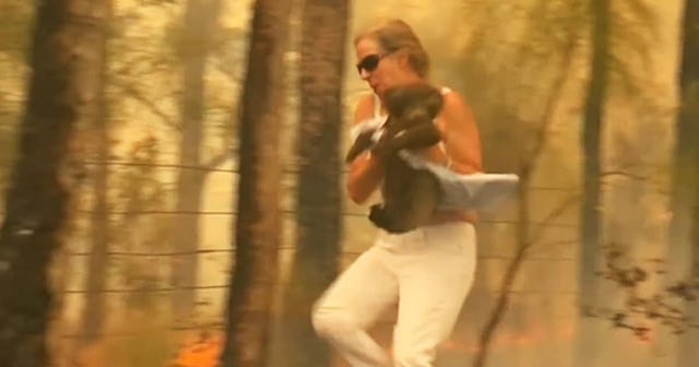Australian woman runs into a brushfire to save a scorched koala using her own shirt