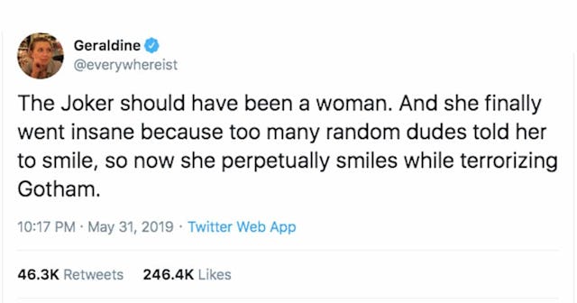 “The Joker should have been a woman. And she finally went insane because too many random dudes told her to smile, so now she perpetually smiles while terrorizing Gotham,” DeRuiter, know as the Everywhereist on Twitter wrote. That sounds logical enough given the sheer amount of times women are told to smile in a day.
