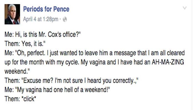 Since Gov. Pence is so all about a woman’s uterus — the women in his state have decided to give him some updates, daily, about the state of theirs. They have been calling his office several times a day, leaving messages about what’s going on in their vaginas. They’ve also been calling the office of Casey Cox, the bill’s author. There’s a Facebook page to organize this effort, and it’s your new favorite thing. It’s called “Periods For Pence.”