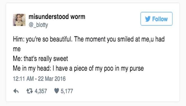 So what do you do when you’re on a first date, you’ve had too much coffee, and nature calls? If you’re Twitter user @_blotty, you use your date’s bathroom. Then you panic when the toilet won’t flush. A floater in a new beau’s toilet on a first date: it’s the first date quandary to end all quandaries.