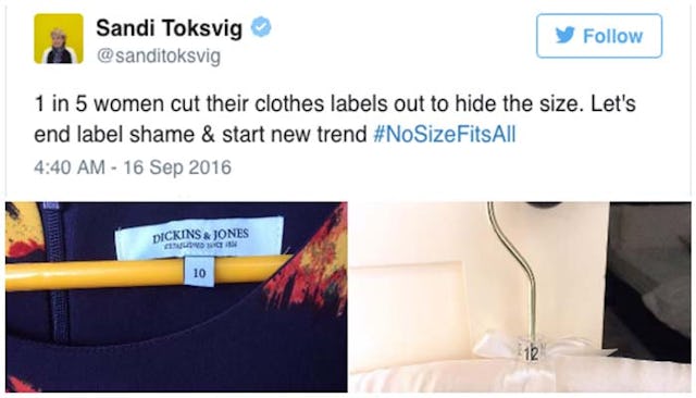 One-in-five women in the UK cut the label out of their clothes, according to the Women’s Equality Party. And of those who do so, 70 percent said it’s done “out of shame and embarrassment at their size.” We feel you, ladies. I’ve cut a few tags out of dresses in my day. For awhile I’d constantly hide my size from boyfriends, but seven years into a relationship and my bad habits have been broken. Why? Because feeling shitty about our size sucks and a lot of women are sick of an industry that constantly shoves this message down our throats.