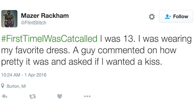 A quick search of the hashtag on Twitter reveals hundreds of responses — seriously it will make your stomach turn. Women are revealing stories about being catcalled for the first time as young as seven or eight years old. Here are just a few of their stories: