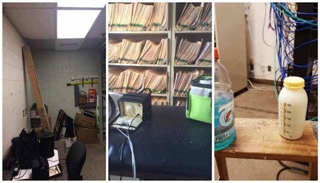 It’s not uncommon to hear about the shame some women face for breastfeeding in public, but for women returning to work who want to continue to breastfeed, pumping is essential and as these photos illustrate — an afterthought for most companies. Who wants to hide in a dirty storage closet to pump? There’s no reason why a clean, private place should be so hard to come by, especially for larger companies.