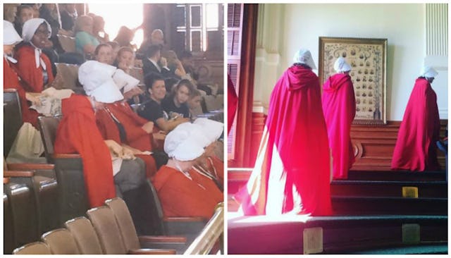 The “dismemberment abortion” bill passed the Senate and now heads to the House for a vote and S.B. 25 is due to go to vote later this week. While the progress of these bills is sadly no surprise, one group of women decided they weren’t going to just stand by and let it happen without comment. About a dozen women came to the session dressed in red robes and white hoods, the classic costume from Margret Atwood’s The Handmaid’s Tale, because that’s exactly how these laws make us feel.