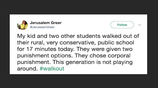 “My kid and two other students walked out of their rural, very conservative, public school for 17 minutes today,” Jerusalem Greer wrote. “They were given two punishment options. They chose corporal punishment. This generation is not playing around. #walkout.”