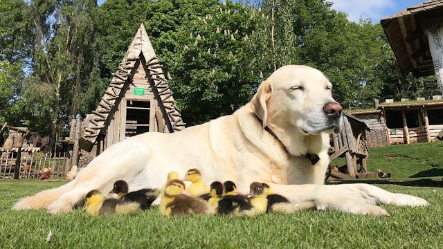 When staff at Mountfitchet Castle noticed the nine ducklings wandering the grounds without a mother, they were worried the poor babies had been orphaned. A little more time confirmed that sad thought: Mama duck never came back. So the castle staff took the tiny birds in. And their dog Fred, who is a Very Good Boy™, was ready to step up and do his part.