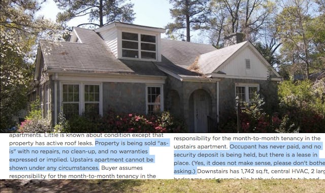 “Little is known about condition except that property has active roof leaks. Property is being sold ‘as-is’ with no repairs, no clean-up, and no warranties expressed or implied.”